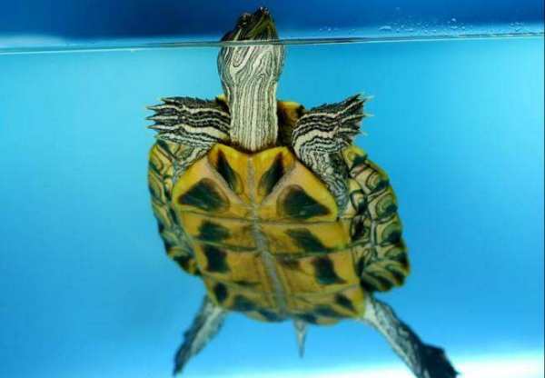 3、经过以上两个步骤之后,可以将挑选出来的乌龟放到水位较深的清水里面,如果乌龟没有下沉则不要。然后注意观察所选择的乌龟是否有腐皮烂甲或短甲症状,如果有,则放弃。因为这些症状不一定可以完全治好,为了乌龟的健康,严格一些也无妨。