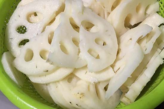 4、切过的藕不宜直接存放,切完后放入水中马上制作,存放可用保鲜膜保存。